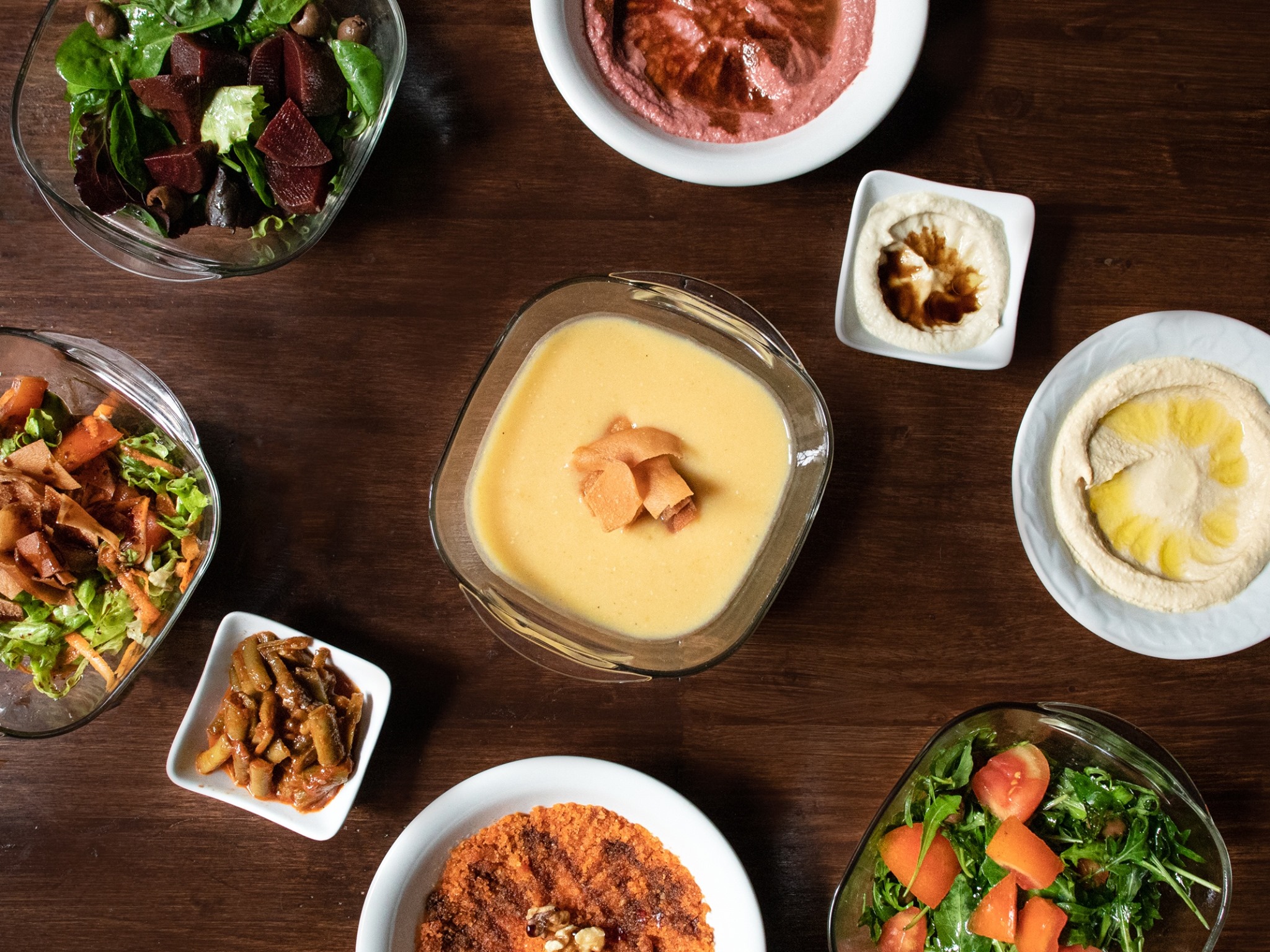 • antipasti freddi: Hummus, Mutabal, Baba ganoush e Kebbet banadora